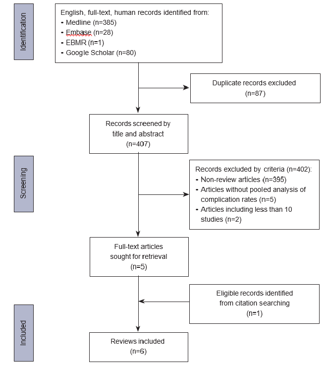 Systematic reviews with or without meta-analysis including more than 10 primary studies were included whilst narrative reviews, case reports, and abstracts were excluded. Furthermore, reviews without pooled analysis of complication rates, not full text, not written in English, or not pertaining to humans were excluded.